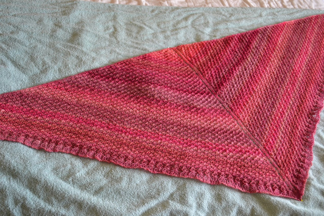 Here's what it looked like before blocking, when I was wondering if I could actually make the top edge straight. That teeny little ball near the center is what yarn I had left, but I foolishly wasn't worried about running out.